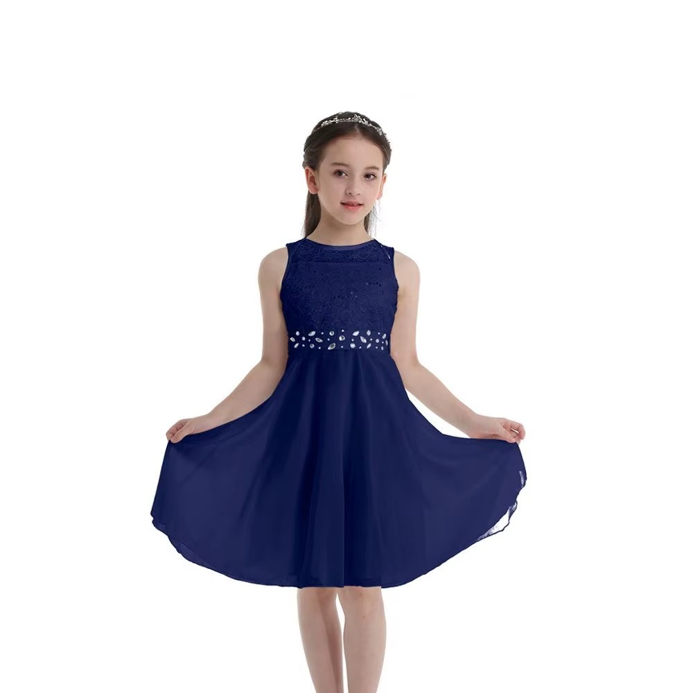 Vakker kjole til jente. Medium lengde. Detaljer med paljetter og blonder på overdel og belte i midje. Lett skjørt med vidde. Passer til anledninger som ball, bryllup, konfirmasjon, dåp eller når du skal være fin på en bursdag eller en sommerdag. 100% polyester. Vaskes skånsomt ved 30 grader.