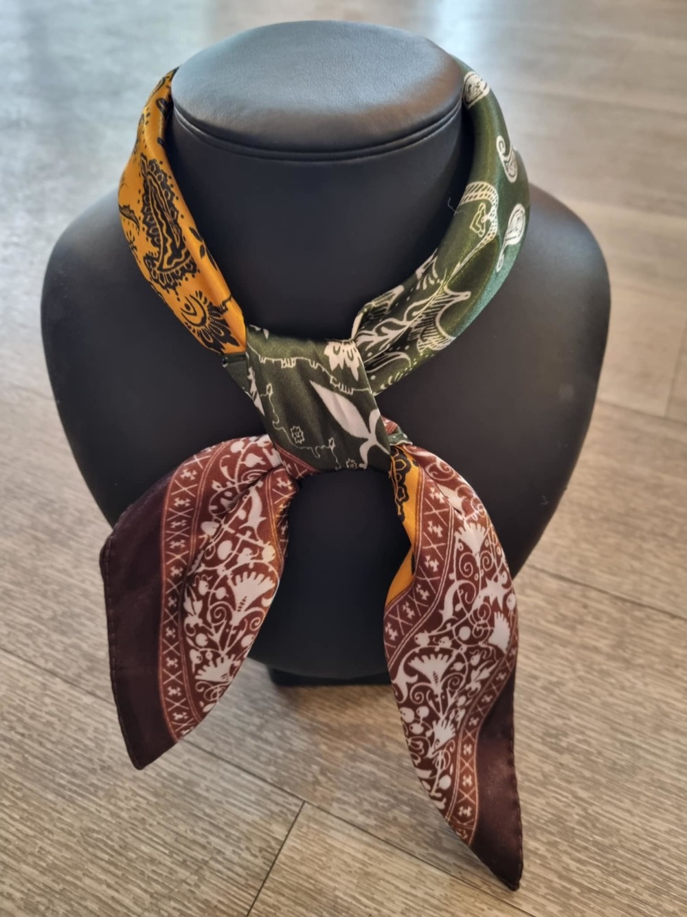Silkeskjerf i mange farger og mønster. Fint tilbehør til både barne og dame festdrakt og bunad. Kjempefin til hverdag og fest. 60x60 cm Polyester/Satin.