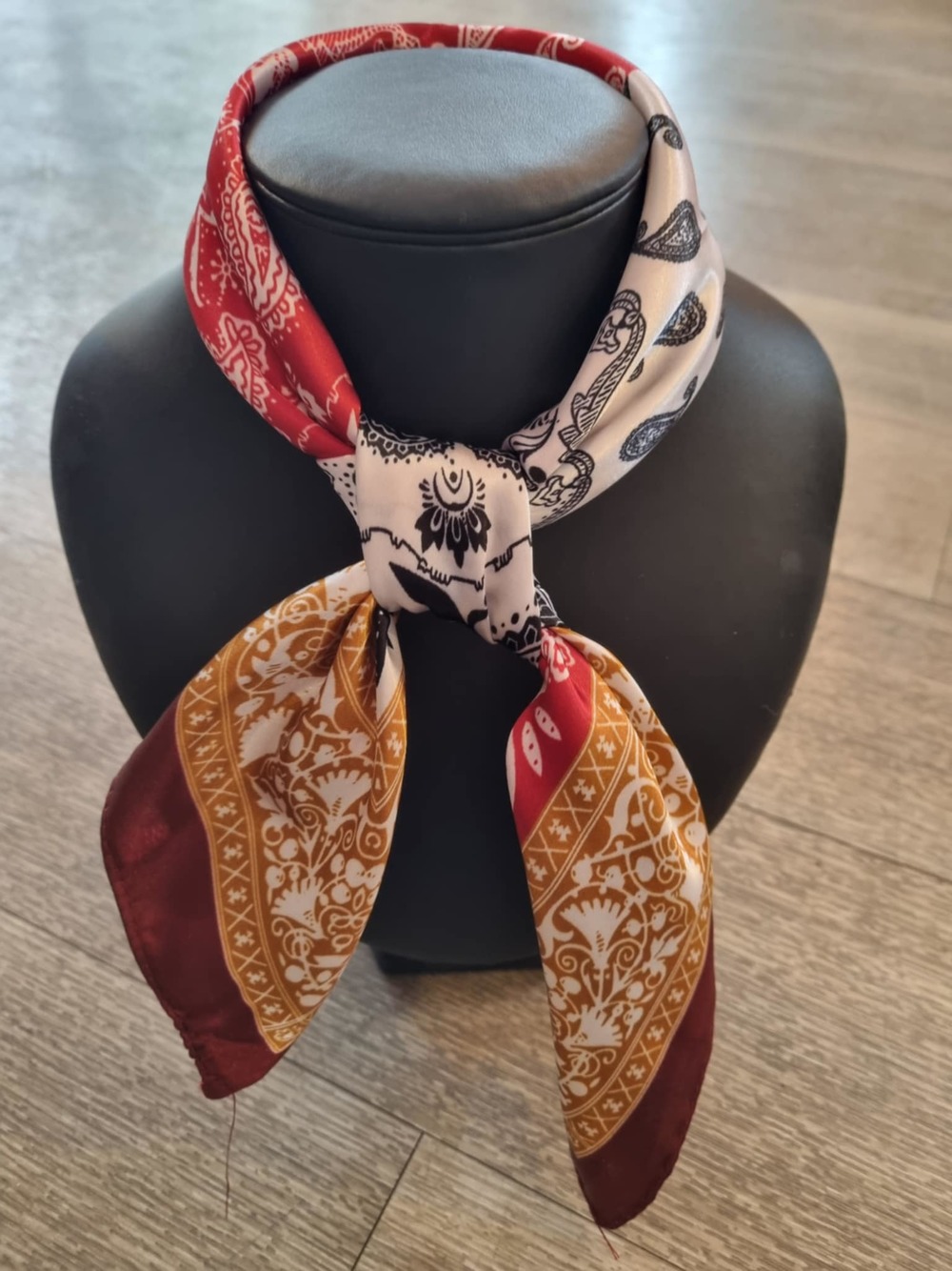 Silkeskjerf i mange farger og mønster. Fint tilbehør til både barne og dame festdrakt og bunad. Kjempefin til hverdag og fest. 60x60 cm Polyester/Satin.