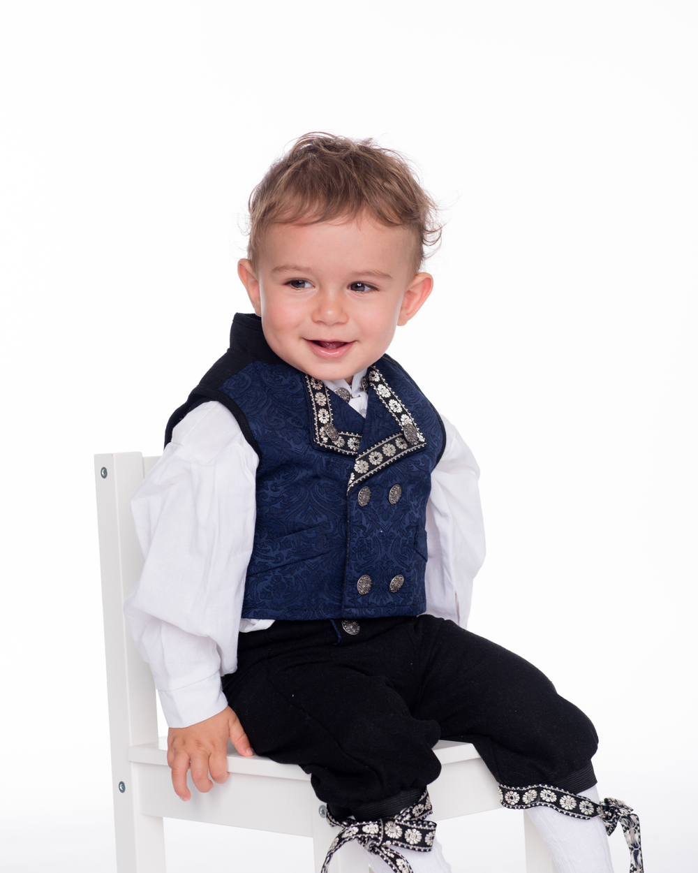 Tradisjonell barnefestdrakt til gutt. Drakt med mange fine detaljer og flott bomull skjorte følger med. "Skinnlapp bak" på nikkers. Brokade vest med fine knapper. Alt kan vaskes på 40 grader. Slang modell, rundt opp om du er i tvil om størrelse.