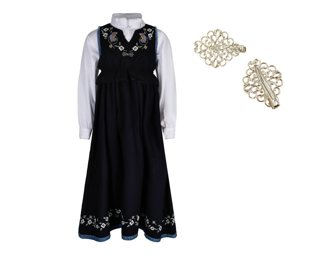 Festdrakt fra Name It i nydelig marine ullstoff og blomster broderi. Pene detaljer og bånd. En variant med blå blomster og en med røde blomster. Drakten er litt stor i størrelsen. Levers med skjorte og spenner.