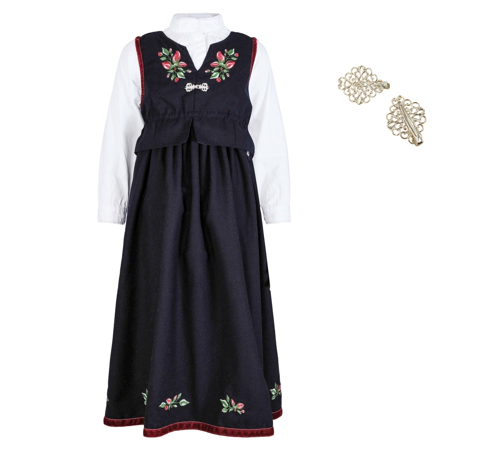 Festdrakt fra Name It i nydelig marine ullstoff og blomster broderi. Pene detaljer og bånd. En variant med blå blomster og en med røde blomster. Drakten er litt stor i størrelsen. Levers med skjorte og spenner.