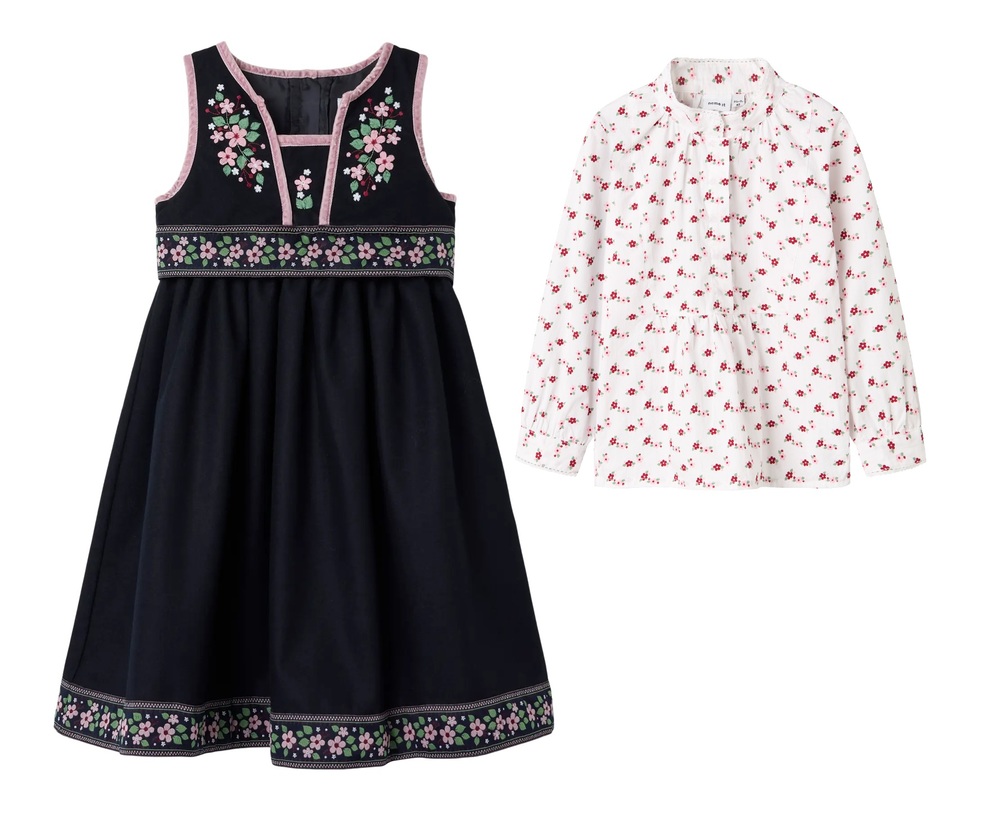 Festdrakt fra Name It i nydelig marine ullstoff og blomster broderi. Pene detaljer og bånd, med røde blomster. Drakten er litt stor i størrelsen. Levers med skjorte.