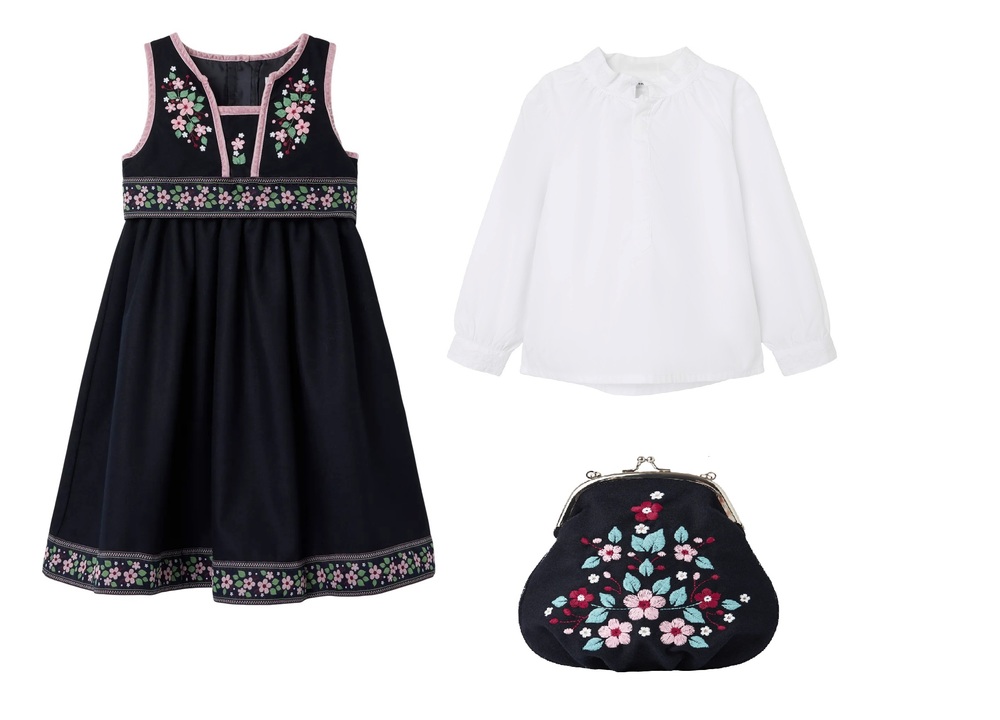 Festdrakt fra Name It i nydelig marine ullstoff og blomster broderi. Pene detaljer og bånd, med røde blomster. Drakten er litt stor i størrelsen. Levers med skjorte.