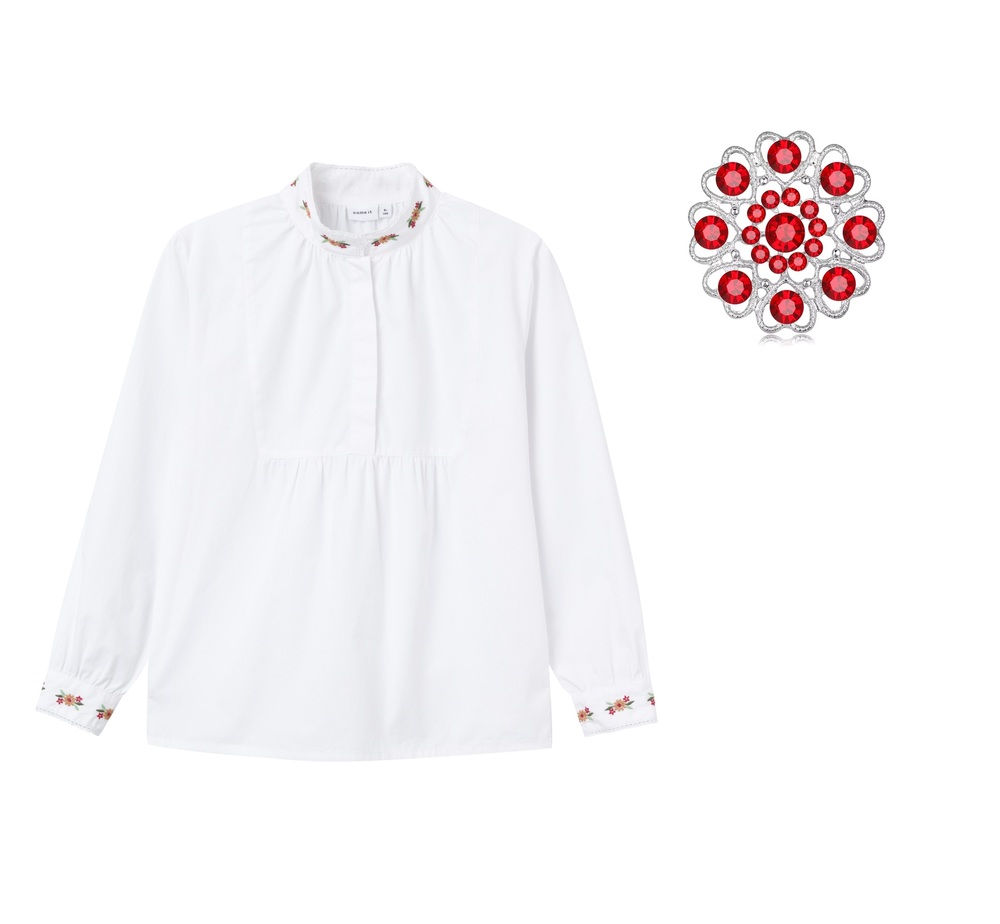 Hvit bomulls bluse med enten hel print blomster eller blomster detaljer på arm og krage. Normal i størrelsen. Leveres med sølje med røde små stener. Lekker sammen med våre silke skjerf og festdrakter.