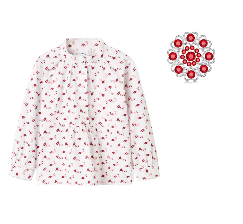 Hvit bomulls bluse med enten hel print blomster eller blomster detaljer på arm og krage. Normal i størrelsen. Leveres med sølje med røde små stener. Lekker sammen med våre silke skjerf og festdrakter.