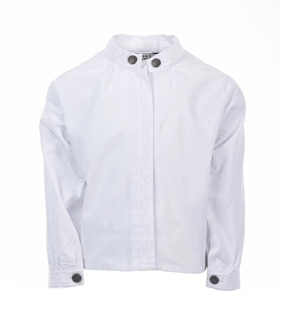 Salto bunadsskjorte eller skjorte til festdrakt er i bomull med to pynteknapper i halsen. Vi har to modeller. En med litt engelsk blonde (jente) og en enkel uten blonder (uniseks) Vaskes på 40 grader.