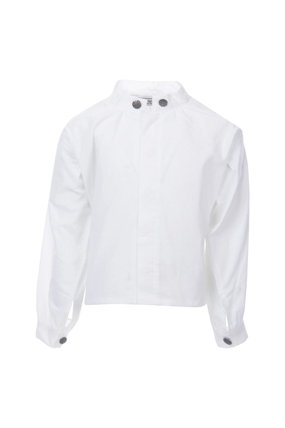 Salto bunadsskjorte eller skjorte til festdrakt er i bomull med to pynteknapper i halsen. Vi har to modeller. En med litt engelsk blonde (jente) og en enkel uten blonder (uniseks) Vaskes på 40 grader.