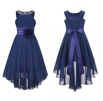 Vakker kjole til jente. Medium lengde. Pen hals med stener på overdel. Bred midje med knyting bak og lett skjørt. Blomsten har sikkerhetsnål og kan flyttes. Passer til anledninger som ball, bryllup, konfirmasjon, dåp eller når du skal være fin på en bursdag. 100% polyester. Vaskes skånsomt ved 30 grader.