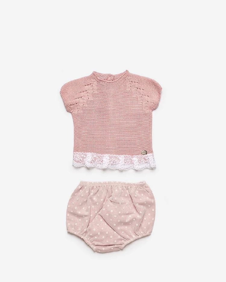 Strikket bomull sett i myk kvalitet. Se detaljer på bilde. Leveres som på bildet. Nytt spansk merke Juliana. Baby og barneklær i meget god kvalitet. Myk bomullstrikk og god kvalitet med blonder, underskjørt osv. For deg som vil ha noe spesielt. Begrenset antall hver sesong.