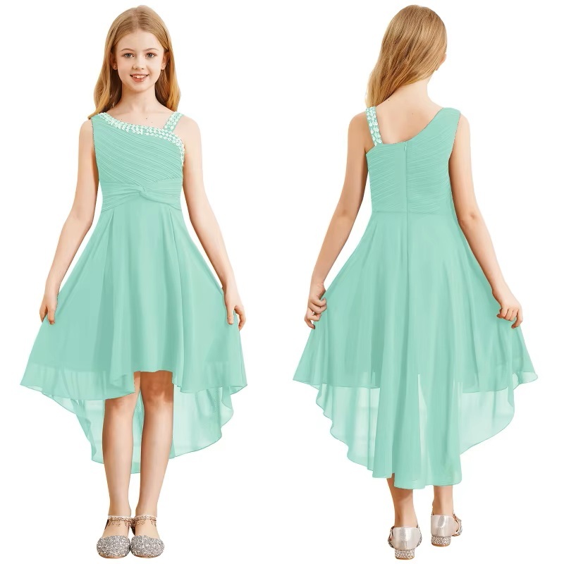 Nydelig kjole til jente. Medium lengde. One shoulder med stropp. Nydelig kant med palljetter. Bred midje med fint snitt og glidelås bak og lett skjørt. Passer til anledninger som ball, bryllup, konfirmasjon, dåp eller når du skal være fin på en bursdag. 100% polyester. Vaskes skånsomt ved 30 grader. NB! Tynne barn bør runde ned om de er mellom to størrelser.