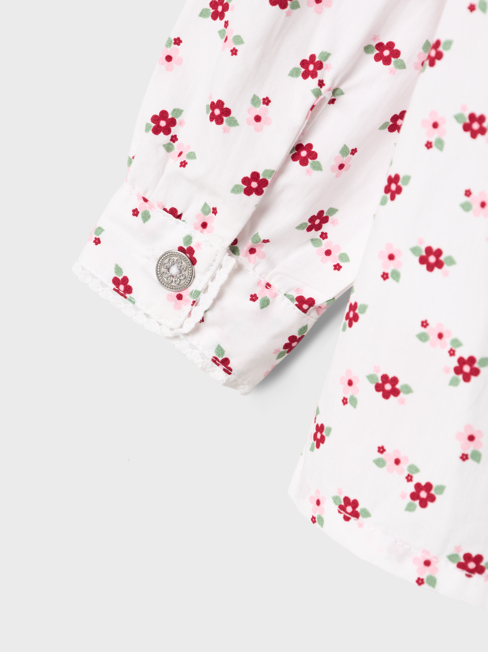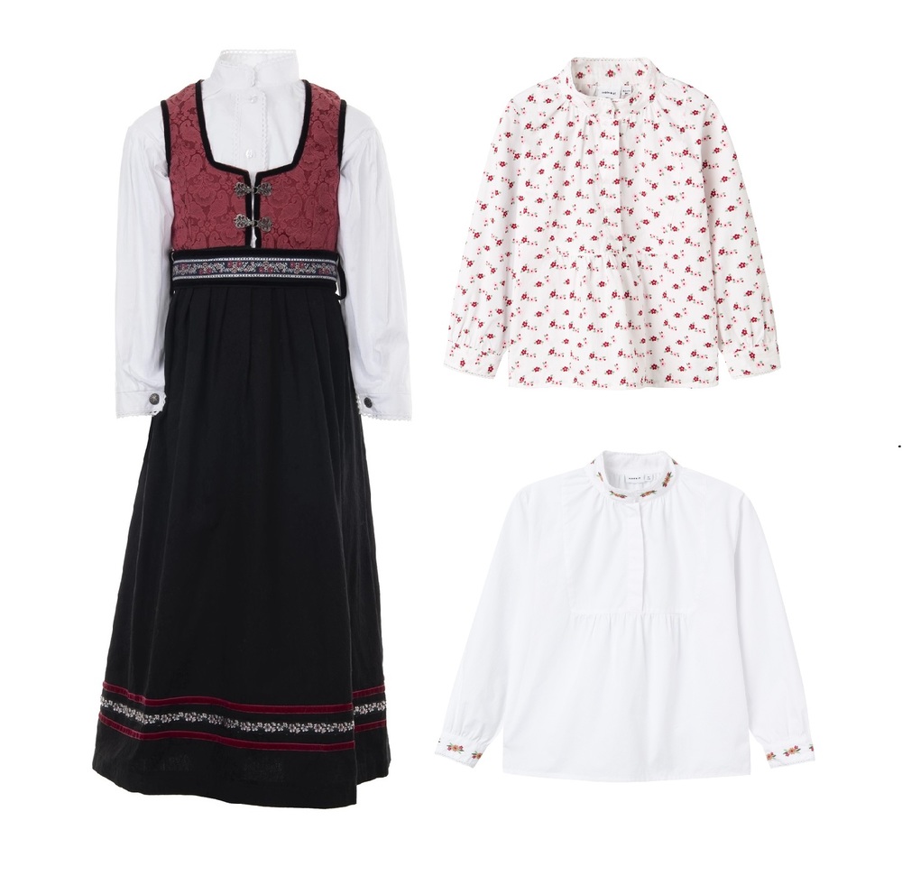 Festdrakt med valgfri skjorte. Velg mellom hvit, hel blomstret eller hvit med blomster detaljer på krage og arm. Nydelig festdrakt i 80% polyester og 20% bomull med mange bånd og detaljer. Belte som kan strammes inn. Skjorte i 100% bomull. Vaskes lett på 30 grader. Rund opp i størrelsen.