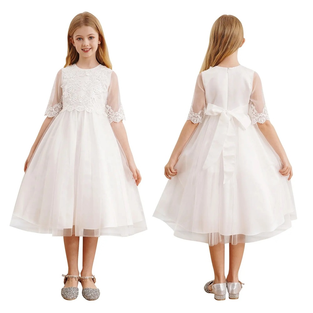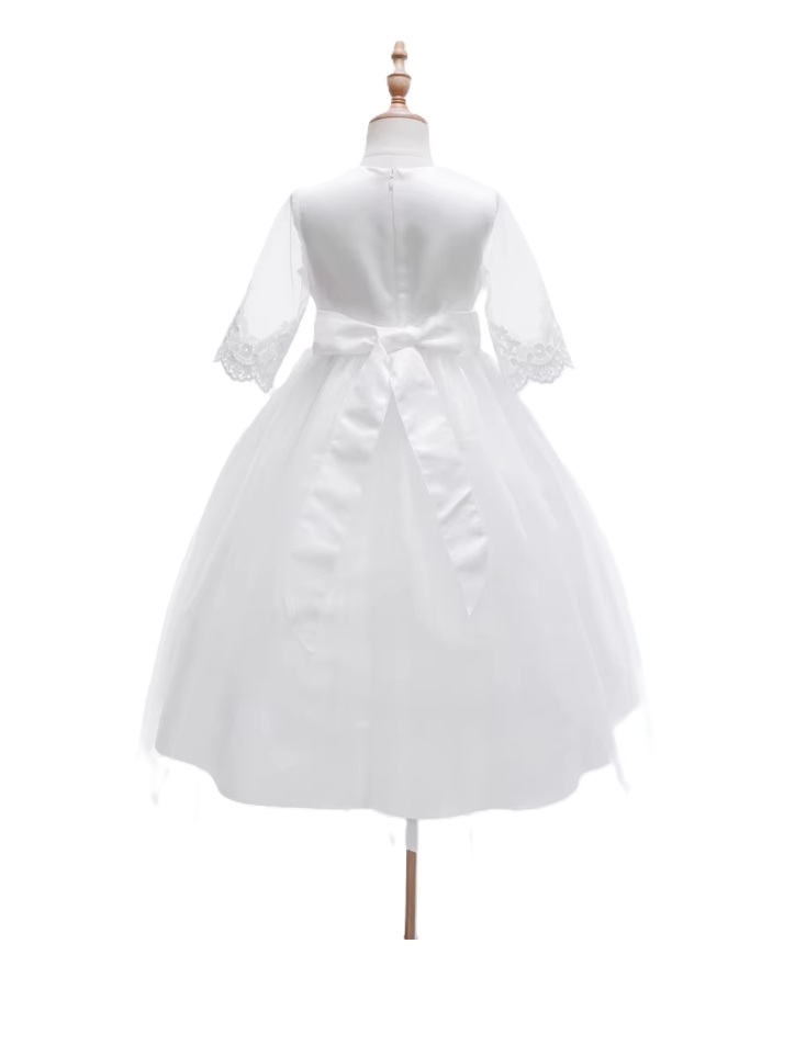 Vakker brudepike kjole med blonder på topp og nede på skjørtet. 3/4 arm i tynn lekker blonde. Mange lag med underskjørt og tyll. 100% nylon. Renses.