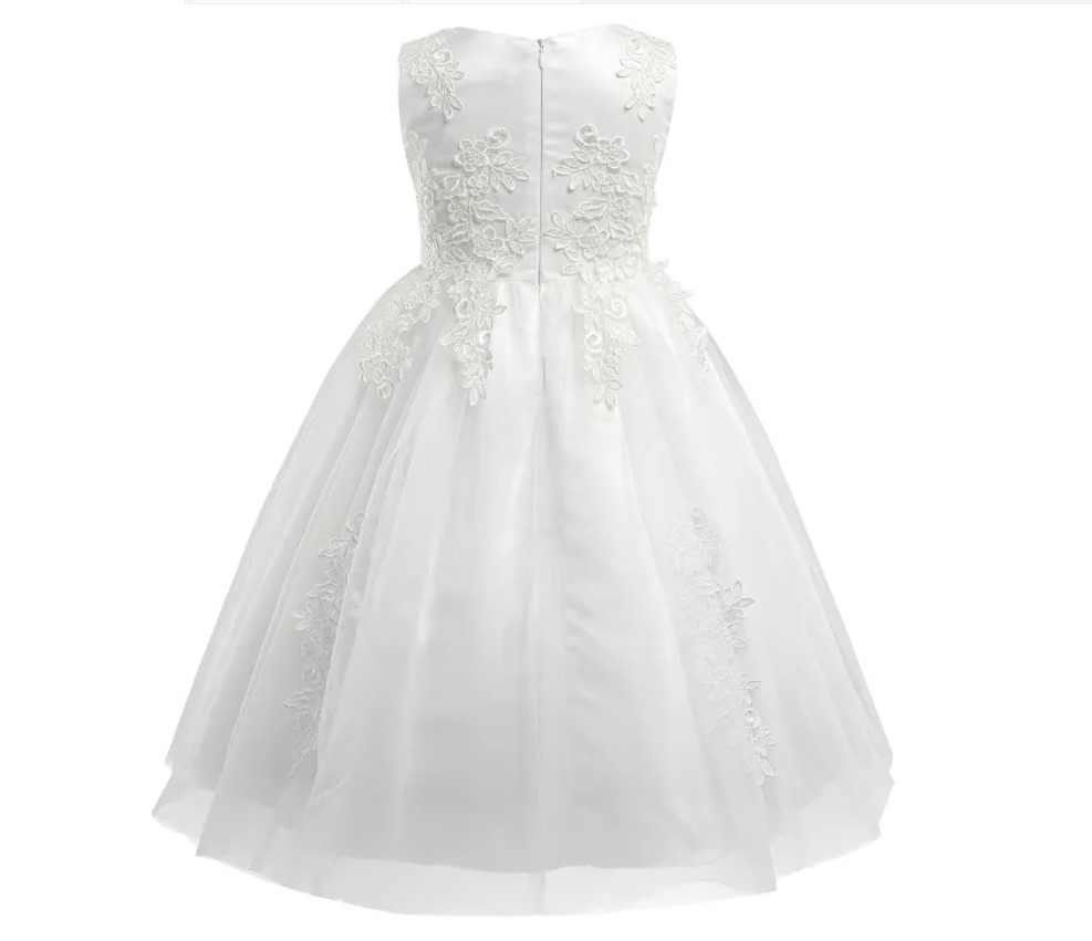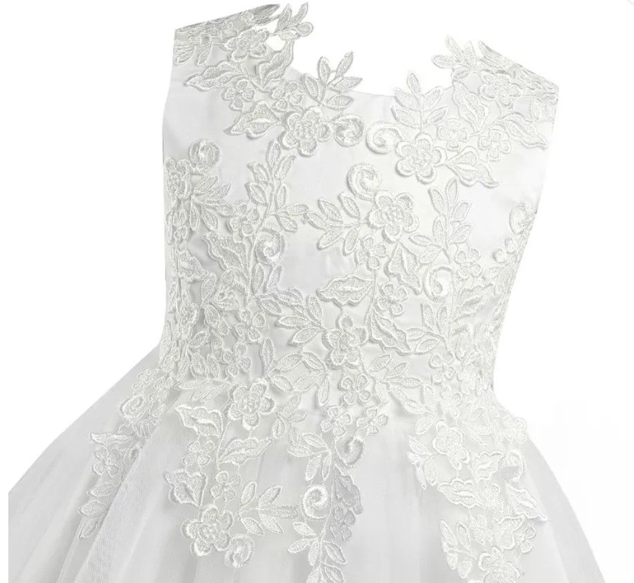 Vakker brudepike kjole med blonder på topp og nede på skjørtet. Mange lag med underskjørt og tyll. 100% nylon. Renses.