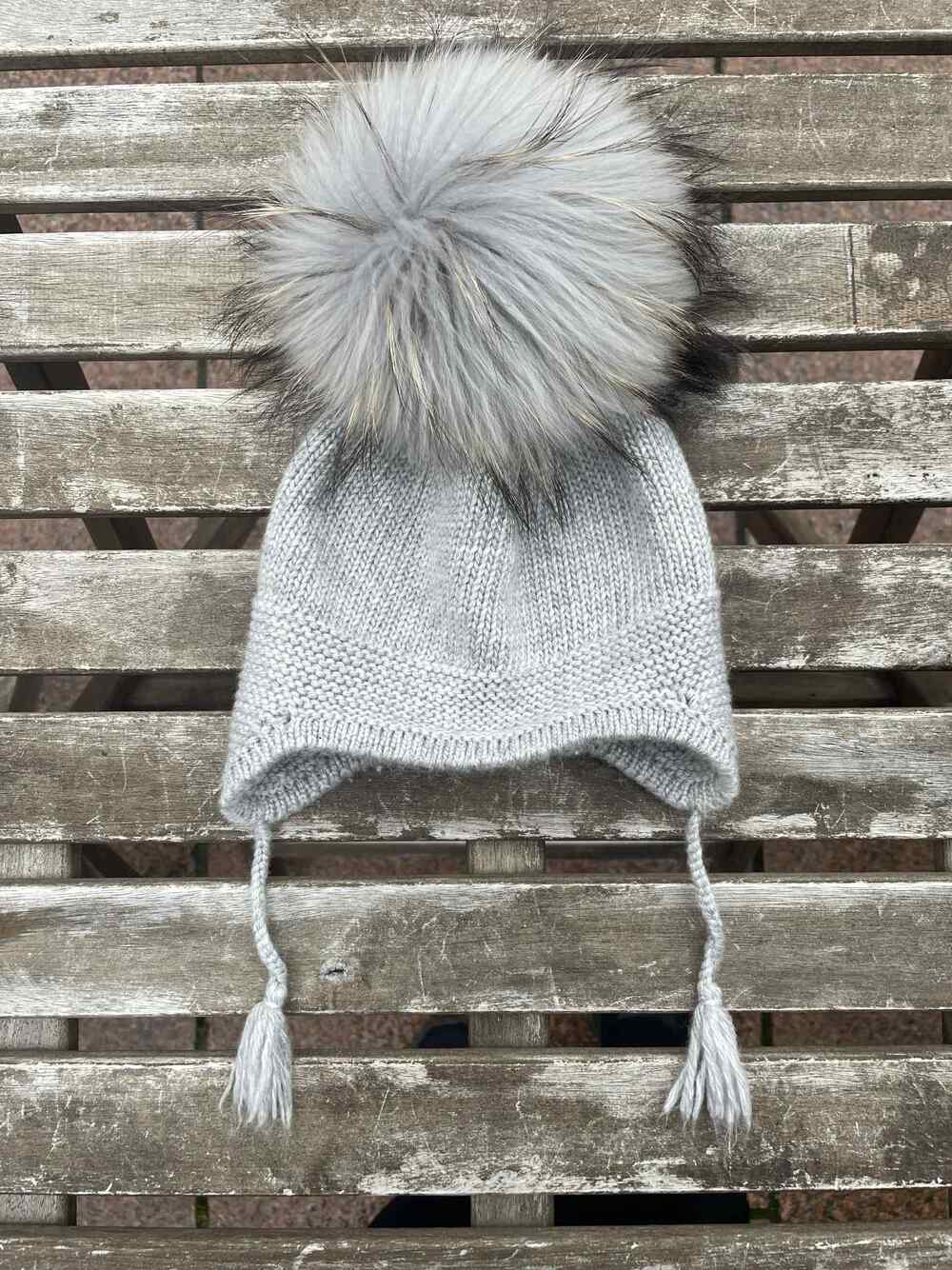 Søt og varm lue i ull med avtagbar pels dusk. Strikket og fleksibel i størrelse. God passform. Finnes i 2 størrelser. Vaskes på ullprogram. Klør ikke.