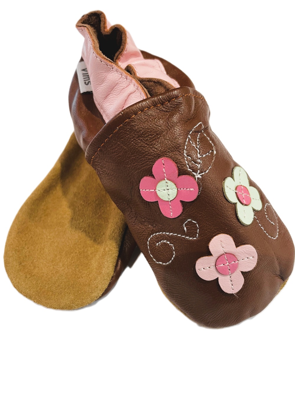 Myke skinntøfler med fine motiv. "sklisikker" såle. Strikk rundt ankel. Kjempefine innesko hjemme og i barnehagen.