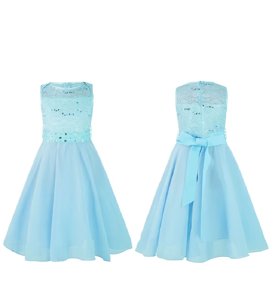 Vakker kjole til jente. Medium lengde. Detaljer med paljetter og blonder på overdel og belte i midje. Lett skjørt med vidde. Passer til anledninger som ball, bryllup, konfirmasjon, dåp eller når du skal være fin på en bursdag eller en sommerdag. 100% polyester. Vaskes skånsomt ved 30 grader.
