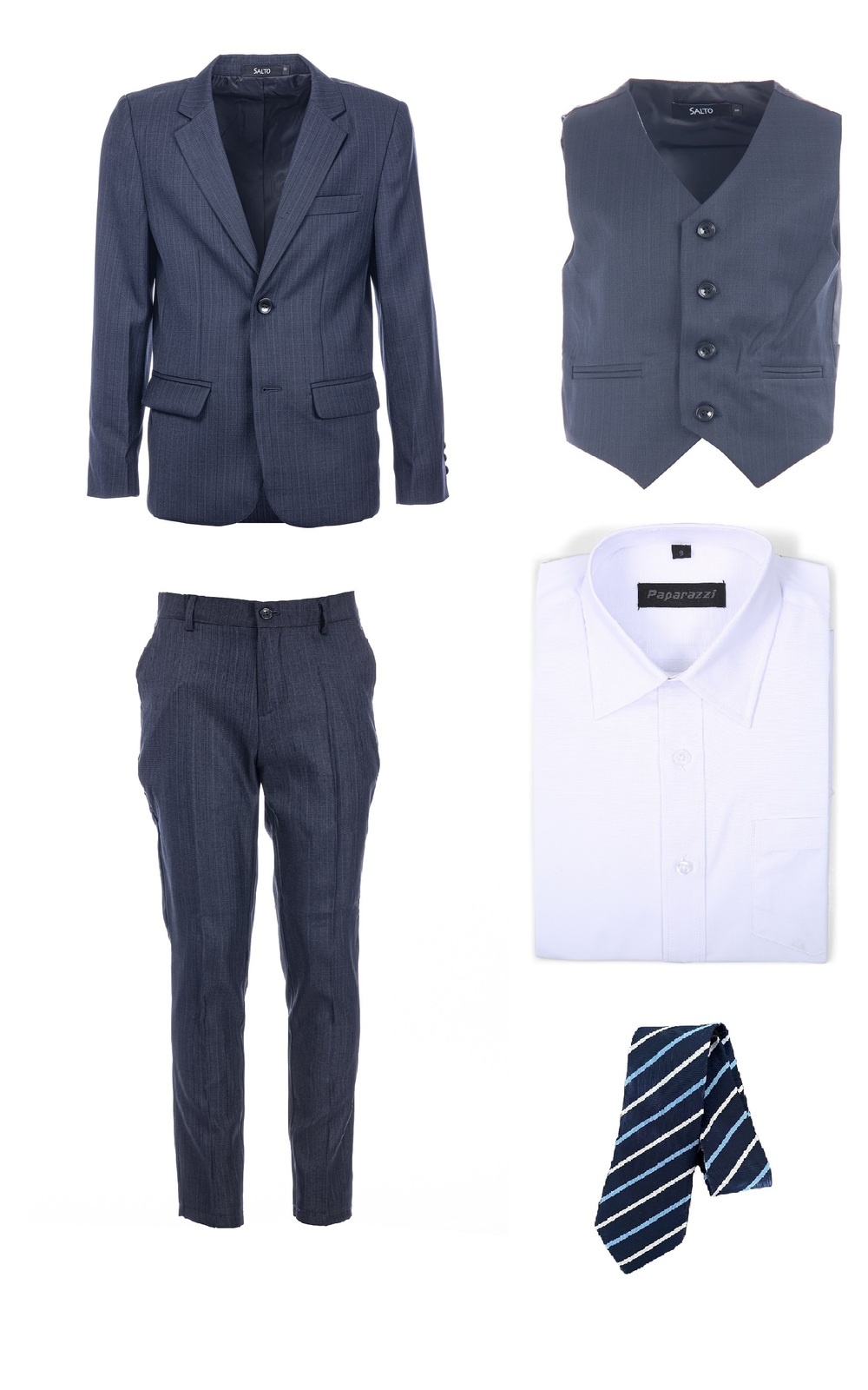 Flott pen dress med fin struktur i stoffet. Slank passform. Rund opp til nærmeste størrelse i forhold til høyde på gutten. Anbefaler rens av dress jakken for at dressen skal holde passformen. Denne modellen er vår bestselger i flere år og mange kjenner Salto dressen. Dressen leveres med jakke, bukse, vest, skjorte og slips. Slips mønster kan avvike fra bildet. Vi velger det slips som passer til utfra vårt utvalg. Vi har stort utvalg skjorter - ring oss gjerne spør om du ønsker en av våre andre Salto skjorter til pakken. Dressen er fin til mange anledninger: konfirmasjon, bryllup, skoleball og bursdager.