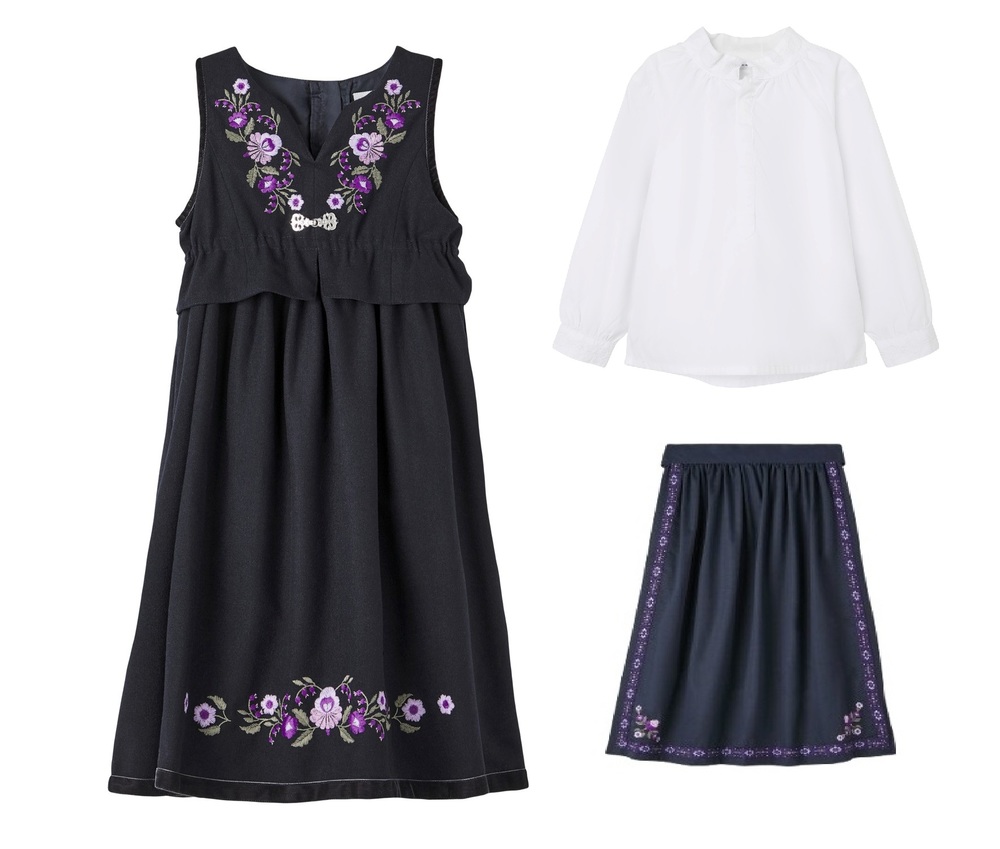 Festdrakt fra Name It i nydelig marine ullstoff og blomsterbrodderi. Pene detaljer. Forkle i lilla med fine detaljer.