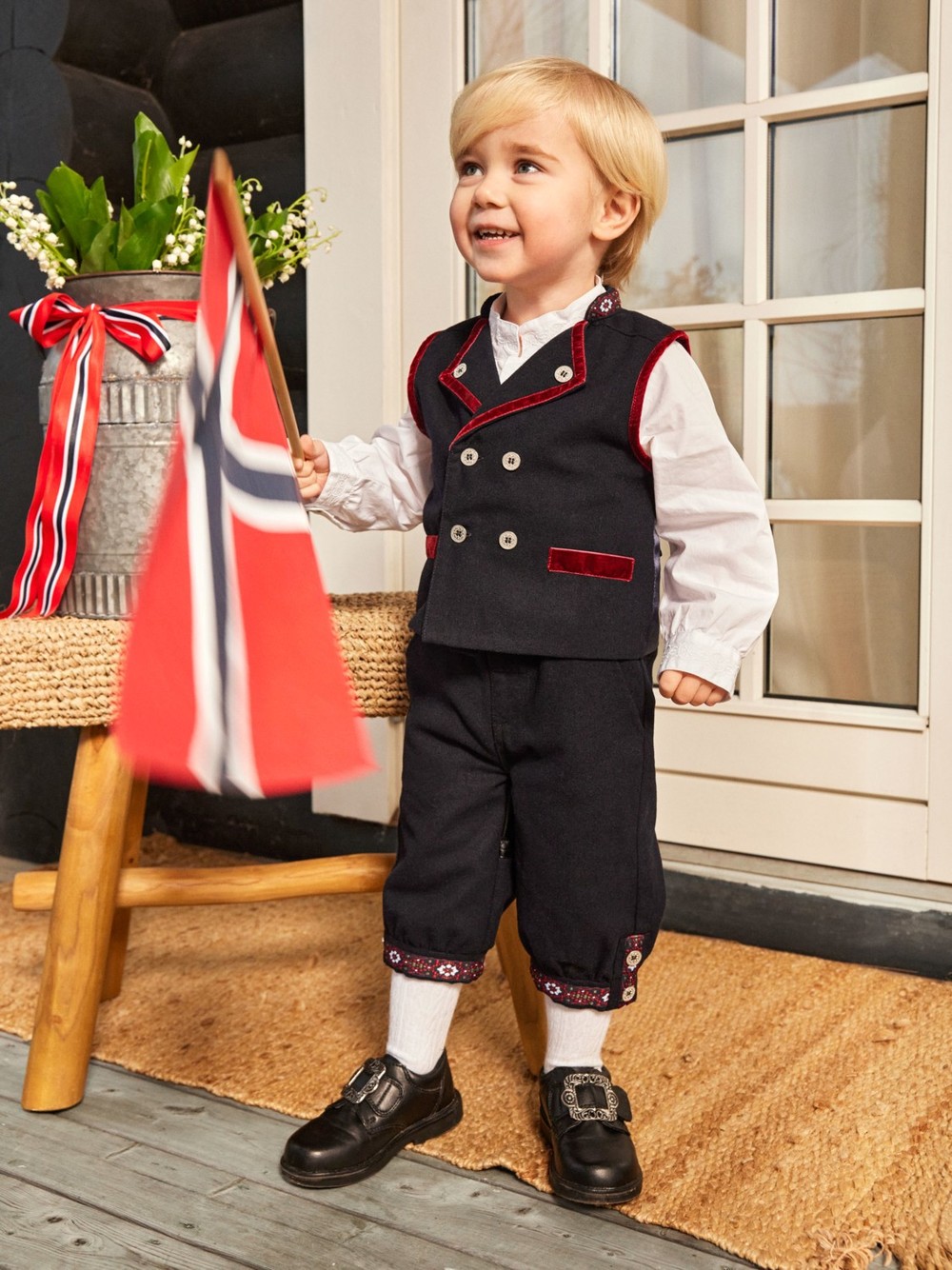 Festdrakter til gutt med skjorte i bomull. Nikkers har tøffe strikk seler og "skinnlapp" bak. Lett å regulere størrelse. Rund opp til nærmeste høyde. Vi har flere pakker som inkluderer strømpebukse eller caps. Se vår nettside guttogpike.no