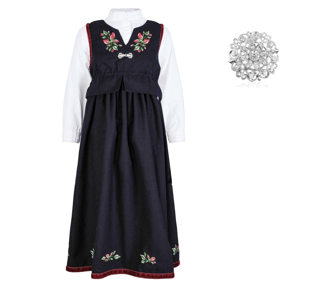 Festdrakt fra Name It i nydelig marine ullstoff og blomster broderi. Pene detaljer og bånd. En variant med blå blomster og en med røde blomster. Drakten er litt stor i størrelsen. Levers med skjorte og spenner.