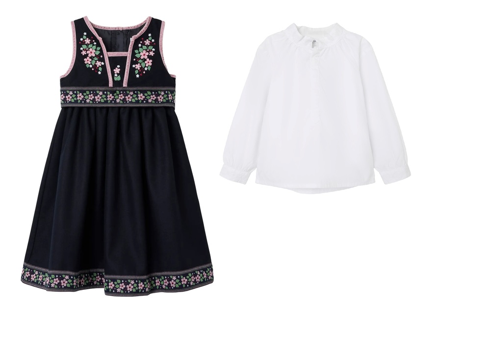 Festdrakt fra Name It i nydelig marine ullstoff og blomster broderi. Pene detaljer og bånd, med røde blomster. Drakten er litt stor i størrelsen. Levers med skjorte.