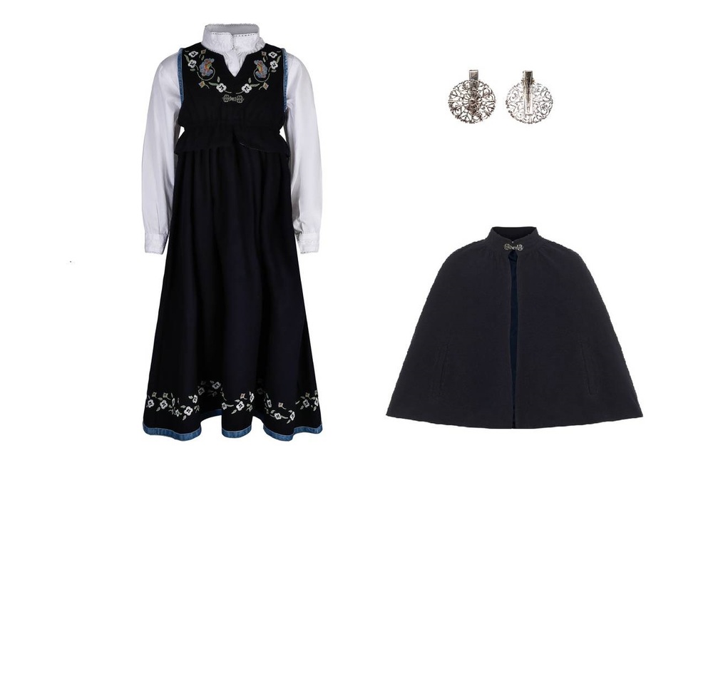 Festdrakt med skjorte og forkle. I tillegg får du spenner og brosje eller cape. Se på bildet hva de forskjellige pakkene inneholder.