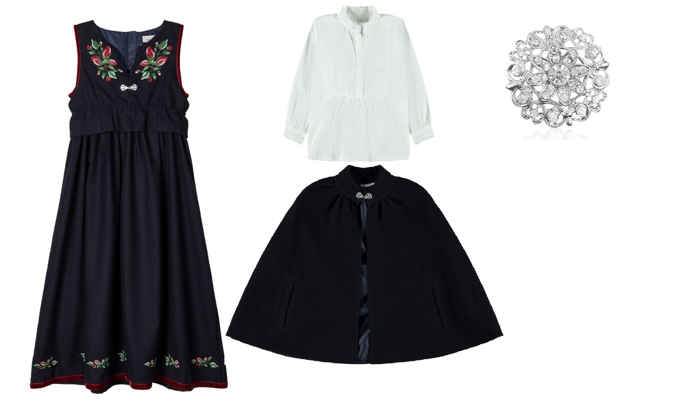 Festdrakt med skjorte og forkle. I tillegg får du spenner og brosje eller cape. Se på bildet hva de forskjellige pakkene inneholder.