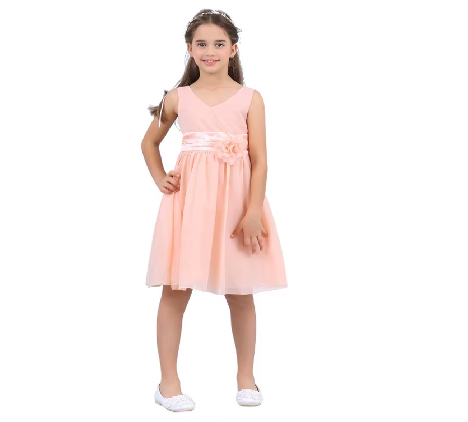 Den er tilgjengelig i flere farger, inkludert rosa, lilla, lyseblå, marine og mintgrønn. Hver kjole har et dekorativt belte med blomsterdetaljer i midjen, som gir en ekstra touch av eleganse. Disse kjolene er ideelle for å skape et sofistikert og festlig utseende. Lykke til med å finne den perfekte kjolen!