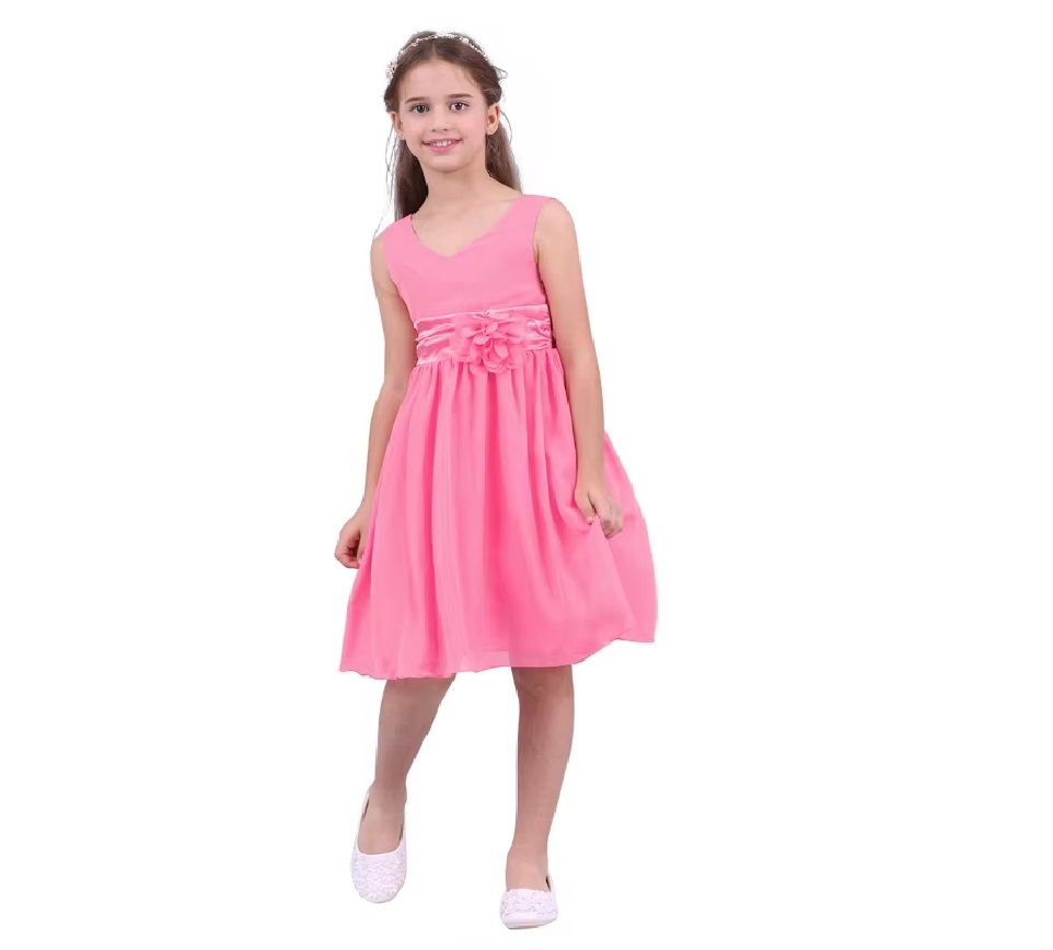 Den er tilgjengelig i flere farger, inkludert rosa, lilla, lyseblå, marine og mintgrønn. Hver kjole har et dekorativt belte med blomsterdetaljer i midjen, som gir en ekstra touch av eleganse. Disse kjolene er ideelle for å skape et sofistikert og festlig utseende. Lykke til med å finne den perfekte kjolen!