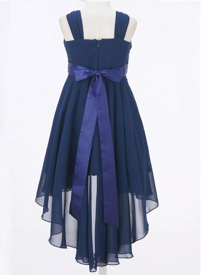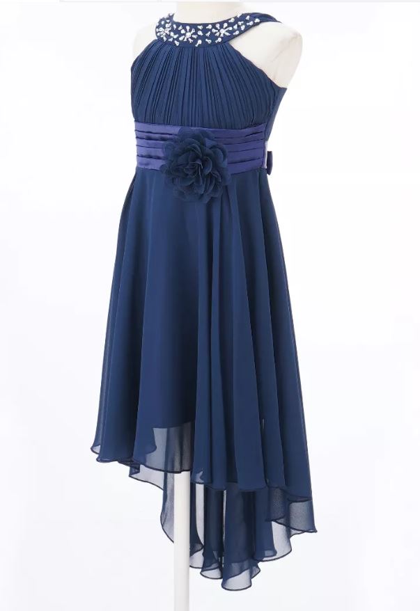 Vakker kjole til jente. Medium lengde. Pen hals med stener på overdel. Bred midje med knyting bak og lett skjørt. Blomsten har sikkerhetsnål og kan flyttes. Passer til anledninger som ball, bryllup, konfirmasjon, dåp eller når du skal være fin på en bursdag. 100% polyester. Vaskes skånsomt ved 30 grader.
