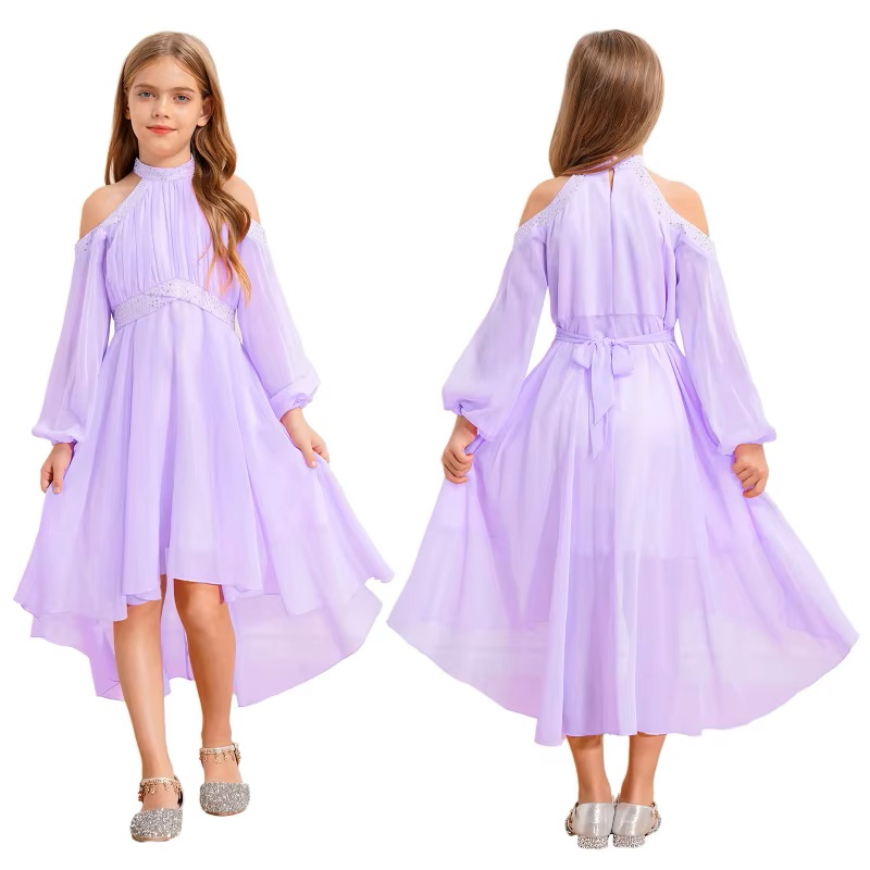 Vakker kjole til jente og ungdom med lange lette armer og åpen skulder. Halterneck hals med små stener og belte i midje med samme små stener på. Beltet kan knytes bak på kjolen. Veldig lekker. Medium lengde foran og lang bak. Normal i størrelse. Eks 12 år - 152 cm høyde