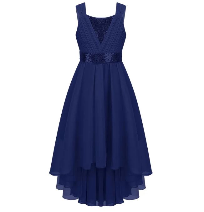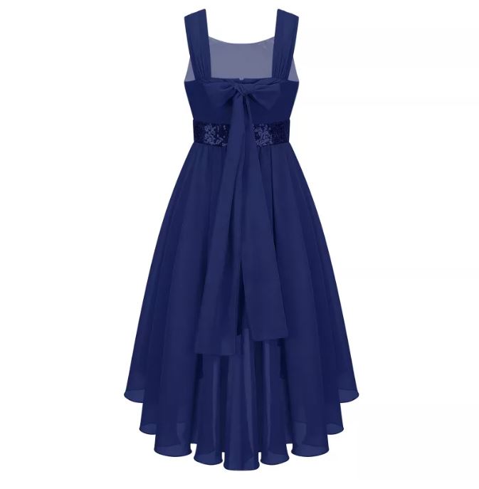 Vakker kjole til jente. Medium lengde. Skrått skjørt. Detaljer med paljetter på overdel og i midje. Sløyfe og lett skjørt med vidde. Passer til anledninger som ball, bryllup, konfirmasjon, dåp eller når du skal være fin på en bursdag eller en sommerdag. 100% polyester. Vaskes skånsomt ved 30 grader.