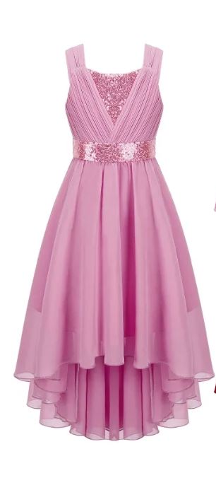 Vakker kjole til jente. Medium lengde. Skrått skjørt. Detaljer med paljetter på overdel og i midje. Sløyfe og lett skjørt med vidde. Passer til anledninger som ball, bryllup, konfirmasjon, dåp eller når du skal være fin på en bursdag eller en sommerdag. 100% polyester. Vaskes skånsomt ved 30 grader.