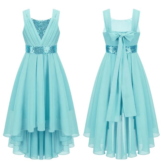 Vakker kjole til jente. Medium lengde. Skrått skjørt. Detaljer med paljetter på overdel og i midje. Sløyfe og lett skjørt med vidde. Passer til anledninger som ball, bryllup, konfirmasjon, dåp eller når du skal være fin på en bursdag eller en sommerdag. 100% polyester. Vaskes skånsomt ved 30 grader.