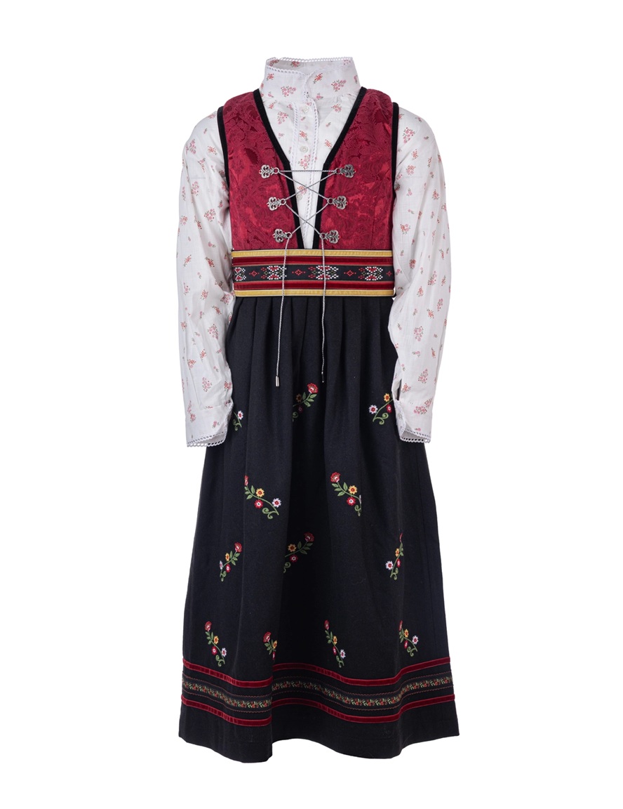 Festdrakten har jacquardvevd liv og pyntebånd langs kanten nederst på skjørtet. På skjørtet er det vevde bånd med delikat blomstermønster, samt vakre broderier rundt hele skjørtet. Det gir et tradisjonelt og vakkert preg. Det ekstra brede beltet med fløyels detaljer og broderte bånd som festes bak og fremhever silhuetten. Ermene er dekorert med fløyelskant og drakten lukkes med tinnfargede hekter foran og en tinnfarget lenke som kan justere størrelsen i bysten.
