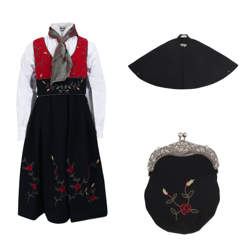 Maxemilia festdrakt, Norsk design i ull med brodrier. Skjorte og skjerf er inkludert. Festdrakten leveres med et legg, som enkelt kan tas opp. Dette forlenger brukstiden til ca 3 år. I tillegg følger det med en ullcape og en brodert veske.
