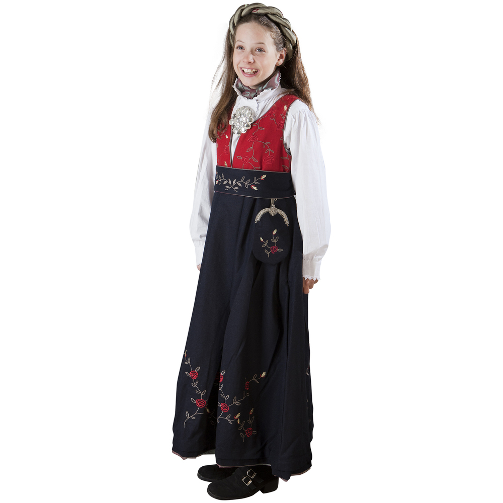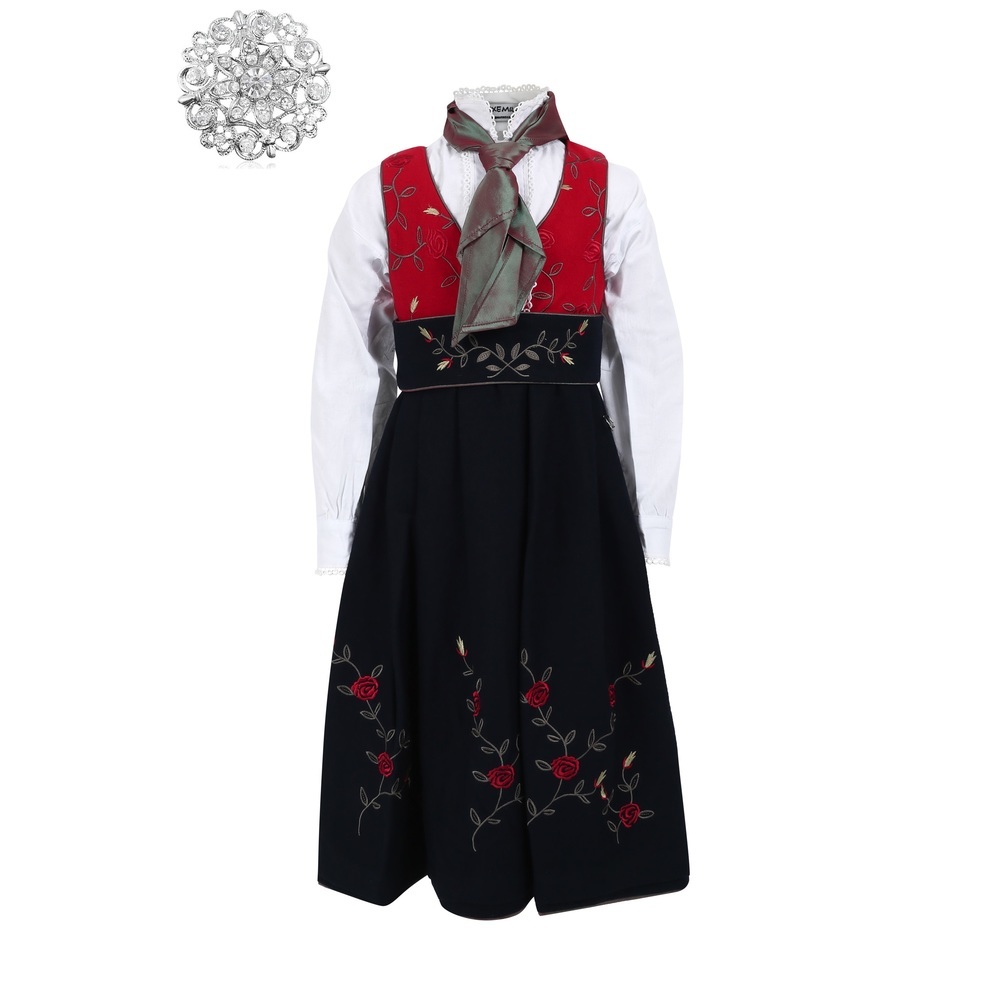 Maxemilia festdrakt i ull med nydelig broderier. Norsk design.. Skjorte og skjerf er inkludert. Festdrakten leveres med et legg, som enkelt kan tas opp. Dette forlenger brukstiden til ca 3 år. Drakten er liten i størrelse. Anbefaler å gå opp en størrelse. Blir skjorten lang på armen, anbefales å brette opp før du knepper.