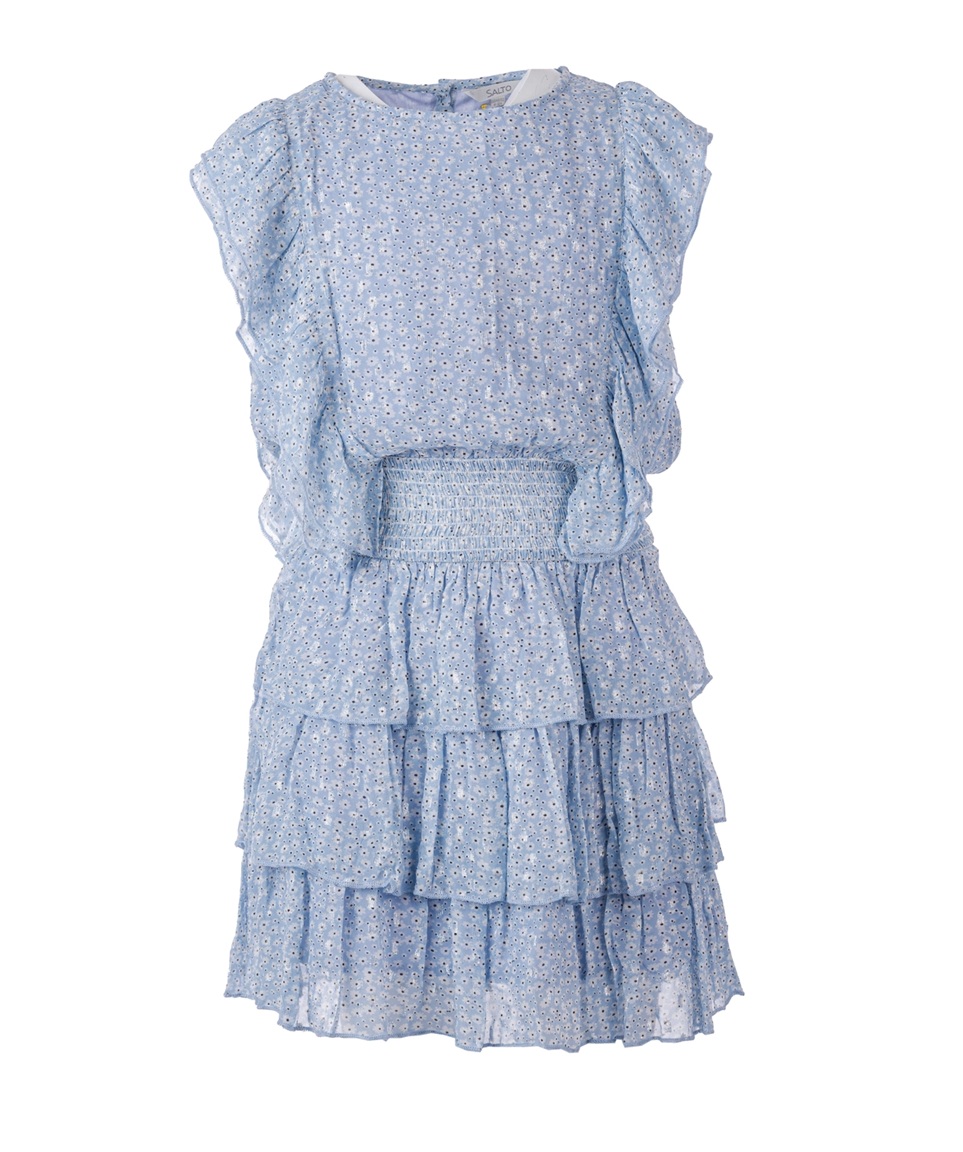 Blomstret kjole med sølv detaljer. Passer til selskap, bursdager og fine sommerdager. Korte armer og rysjekant.100% polyester som vaskes på 40 grader.