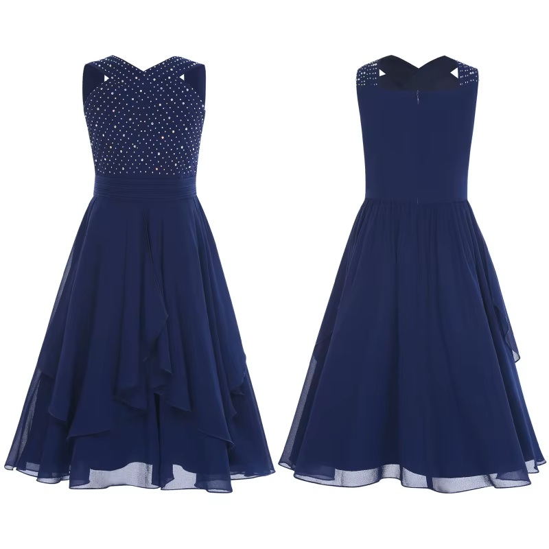 Søt kjole til jente og ungdom uten armer. Kjolen er fylt med små stener på overdelen. Skjørtet har medium lengde og er luftig og ledig. Veldig fin. Eks 12 år - 152 cm høyde