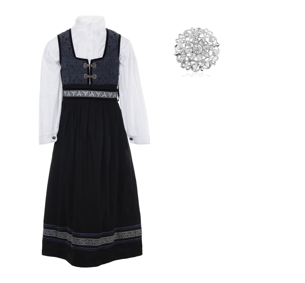 Festdrakt, skjorte og sølje. Nydelig festdrakt i 80% polyester og 20% bomull med skjorte i 100% bomull. Vaskes lett på 30 grader. Nydelig brosje følger med! Normal størrelse på drakt.