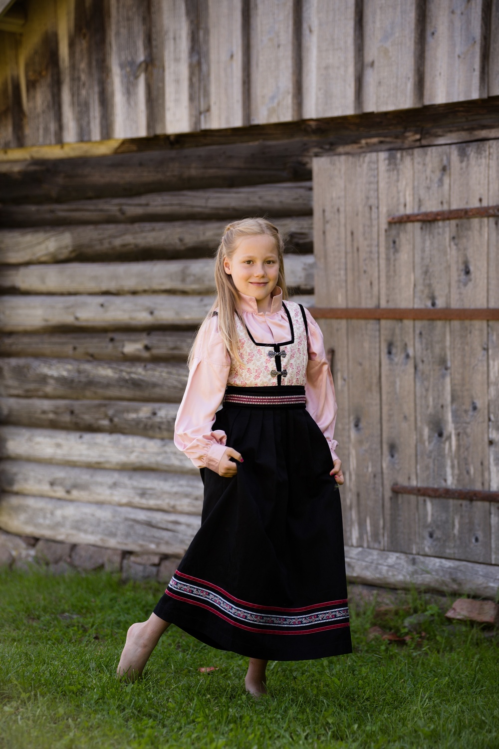 Nyhet! Festdrakt med rosa skjorte. Fine bånd og detaljer. Belte i liv som kan strammes. Det finnes veske og silkeskjerf som kan kjøpes i tillegg.