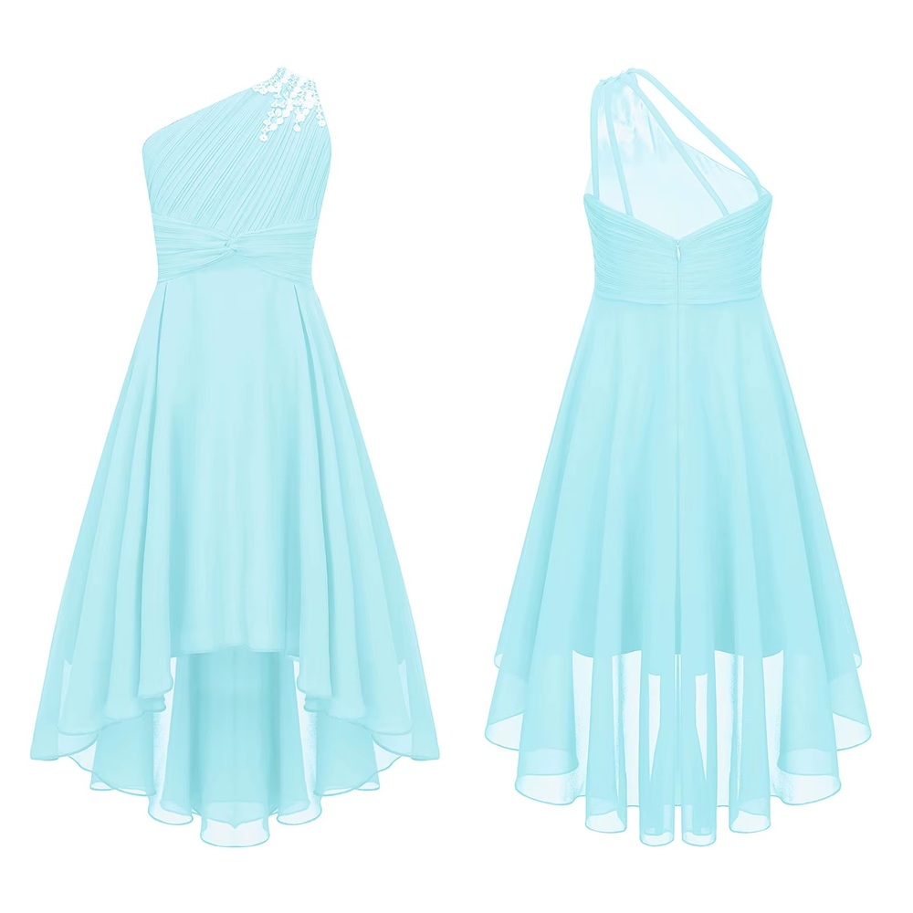 Nydelig kjole til jente. Medium lengde. Drapperinger på overdel. Bred midje med fint snitt og glidelås bak og lett skjørt. Blomsten har sikkerhetsnål og kan flyttes. Passer til anledninger som ball, bryllup, konfirmasjon, dåp eller når du skal være fin på en bursdag. 100% polyester. Vaskes skånsomt ved 30 grader.