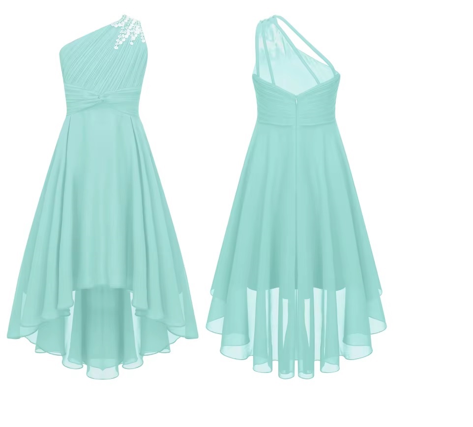 Nydelig kjole til jente. Medium lengde. Drapperinger på overdel. Bred midje med fint snitt og glidelås bak og lett skjørt. Blomsten har sikkerhetsnål og kan flyttes. Passer til anledninger som ball, bryllup, konfirmasjon, dåp eller når du skal være fin på en bursdag. 100% polyester. Vaskes skånsomt ved 30 grader.