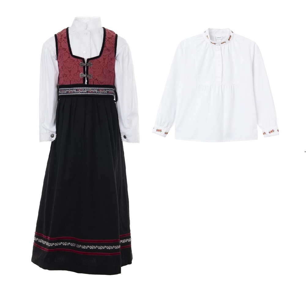 Festdrakt med valgfri skjorte. Velg mellom hvit, hel blomstret eller hvit med blomster detaljer på krage og arm. Nydelig festdrakt i 80% polyester og 20% bomull med mange bånd og detaljer. Belte som kan strammes inn. Skjorte i 100% bomull. Vaskes lett på 30 grader. Rund opp i størrelsen.
