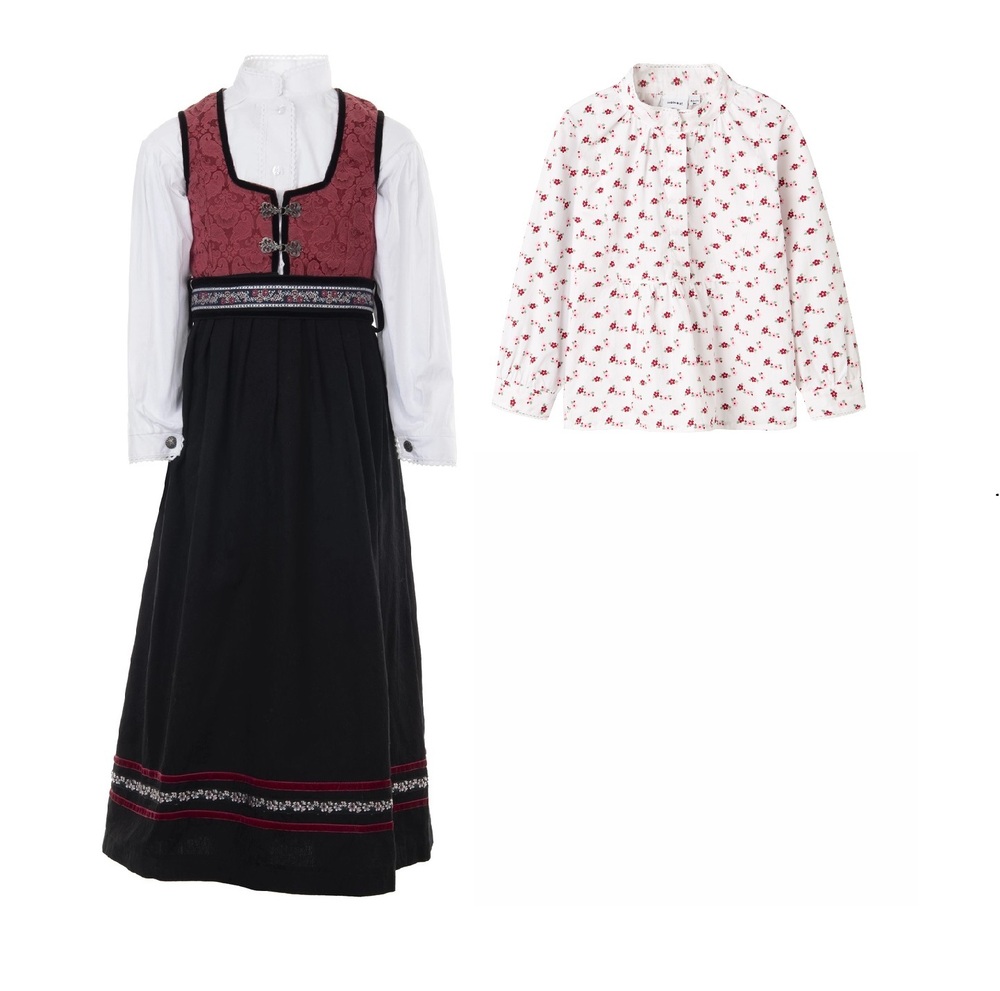 Festdrakt med valgfri skjorte. Velg mellom hvit, hel blomstret eller hvit med blomster detaljer på krage og arm. Nydelig festdrakt i 80% polyester og 20% bomull med mange bånd og detaljer. Belte som kan strammes inn. Skjorte i 100% bomull. Vaskes lett på 30 grader. Rund opp i størrelsen.