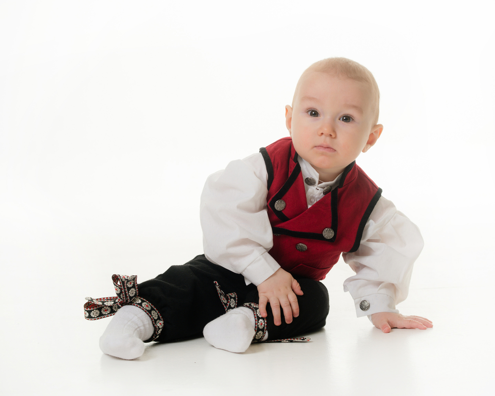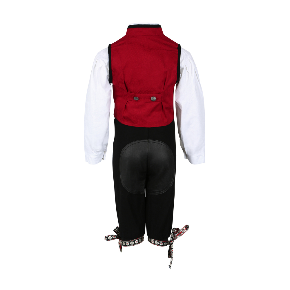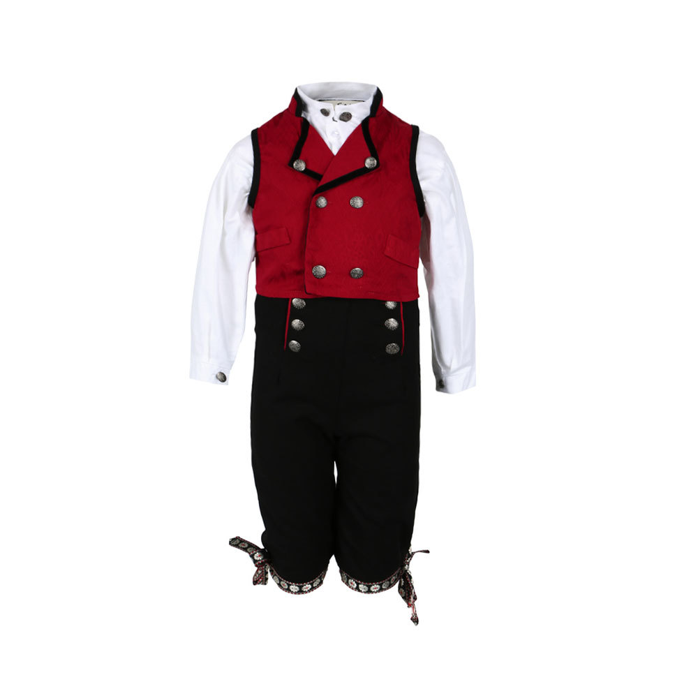 Salto festdrakt til gutt består av nikkers, skjorte og vest. Nikkers har regulerbare seler og "skinn" bak, flotte bånd å knyte nede. Vesten har mange fine detaljer og bånd. Skjorten er i bomull med knapper i hals. Slank modell - gå gjerne opp litt i størrelse.