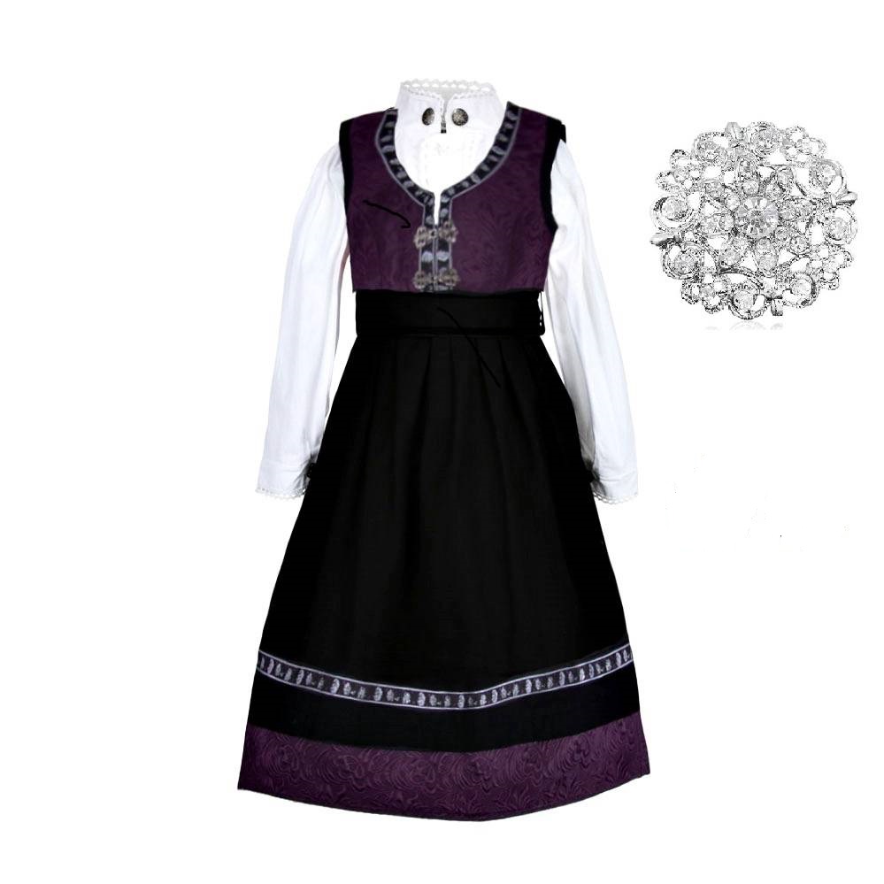 Festdrakt, skjorte og sølje. Nydelig festdrakt i 80% polyester og 20% bomull med skjorte i 100% bomull. Vaskes lett på 30 grader. Nydelig brosje følger med! Normal størrelse på drakt. Veske følger ikke med.
