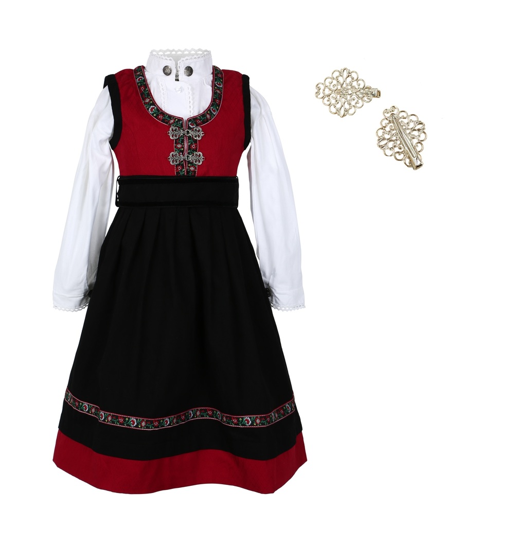 Festdrakt, skjorte og sølje. Nydelig festdrakt i 80% polyester og 20% bomull med skjorte i 100% bomull. Vaskes lett på 30 grader. Nydelig brosje følger med! Normal størrelse på drakt. Veske følger ikke med.
