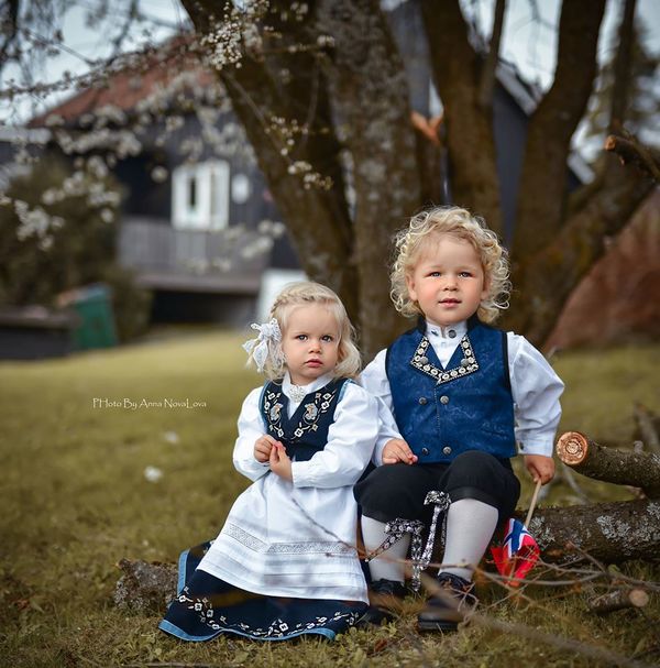 Salto drakt til gutt: Bomullsskjorte og nikkers med skinn "bak", seler og brokadevest med bånd og knapper. Polyester og bomull. Kjempefint søskensett. Bestillers hver for seg.